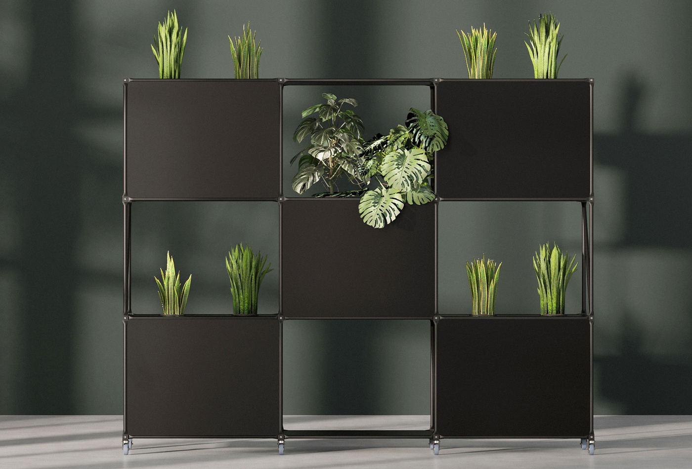 Über minimum erhalten Sie Florafilt als Solitär oder exklusiv in Kombination mit dem System 180. Im raumgliedernden Regalsystem fügen sich die Pflanzen mit ihrer ausgeklügelten und wartungsarmen Technik optimal ein und geben dem vielseitigen System zusätzlich Leichtigkeit.