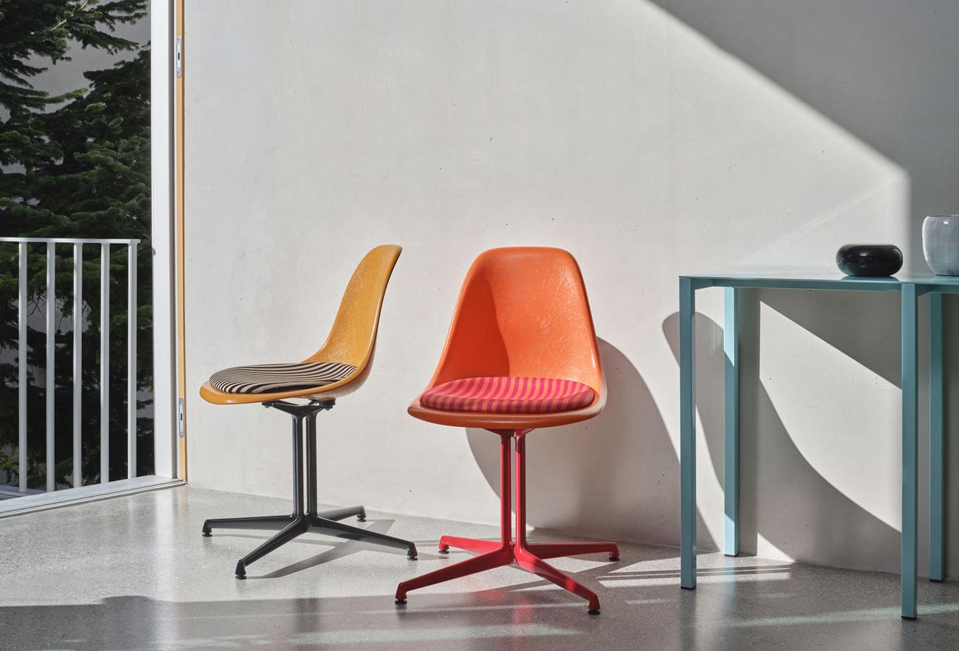 Der Eames Fiberglass Side Chair La Fonda ist in einer limitierten Auflage erhältlich, die die Sitzschale von Charles und Ray Eames mit Kissen aus dem Toostripe-Stoff von Alexander Girard kombiniert. Der Stuhl ist in zwei Farbversionen mit je 250 Stück erhältlich. Die Farbkombinationen sind: