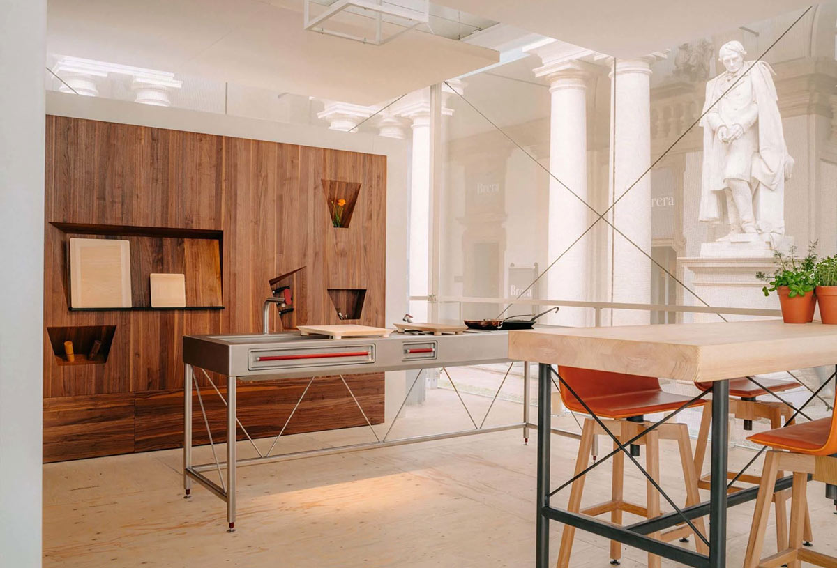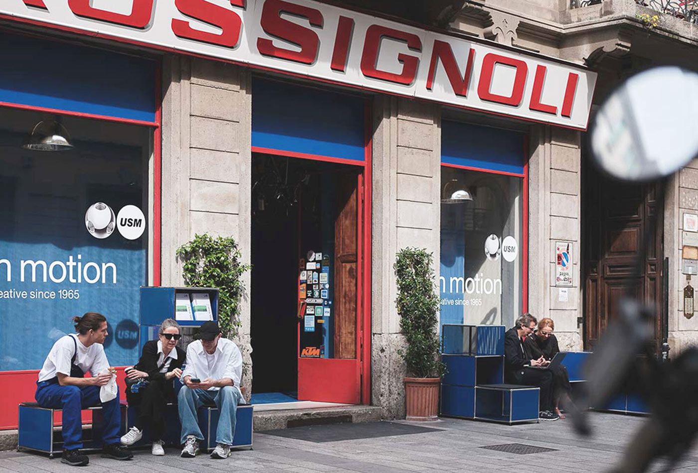 Von der Via Brera 28 ging es über Umwege in den Corso Garibaldi. Schon zum fünften Mal stellte USM in Mailands bekanntestem Fahrradladen Rossignoli aus. Nach vielen Special Editions, die der Autorin sehr gut gefallen, aber das modulare System USM ad absurdum geführt haben, standen in diesem Jahr Modularität und Geschichte im Vordergrund. Neben dem Café »Da Fritz e Paul«, das Fritz Haller und Paul Schärer, den Vätern von USM gewidmet hatten, wurde die Fahrradwerkstatt zur USM-Werkstatt. Hier wurde das System aus Kugeln, Rohren, Konnektoren und bunten Blechen gleichzeitig an einem Ende auf- und am anderen Ende wieder abgebaut. Besser konnte man die Vorteile von USM nicht vorführen. Und haben Sie schon mal eine Deckenleuchte aus USM-Elementen gesehen oder eine Bank, die ausschließlich aus USM-Rohren bestand? Wir sind nach wie vor inspiriert und freuten uns über ein interessantes Exponat, ein Registraturwagen aus der ersten USM-Serie von 1965, der immer noch mit dem USM-Möbelsystem kompatibel ist.