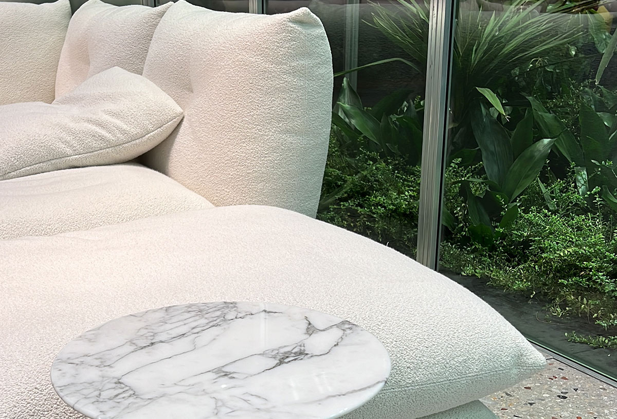 Gallotti & Radice: die Beistelltische Clemo, Re-verra und Monete nebem dem Cloud Infintiy Sofa und unter der Lampe Bolle Tela