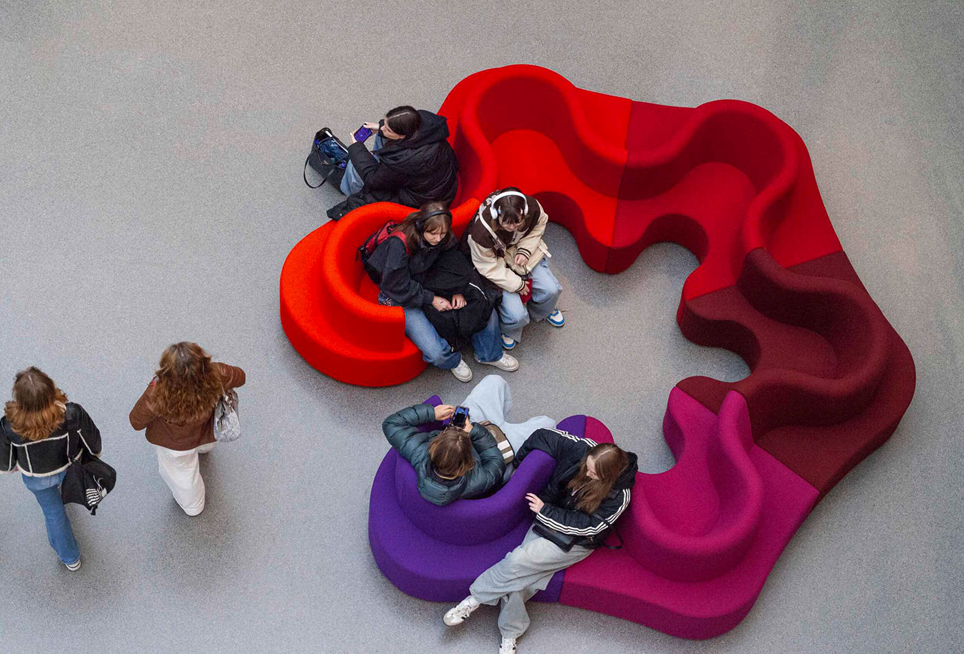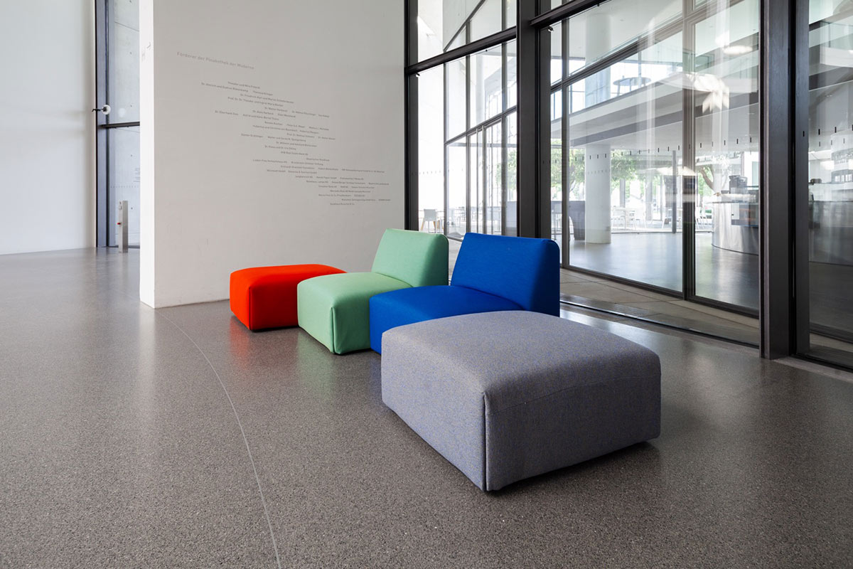 Das modulare Sofa Costume (2021) von Stefan Diez und Dominik Hammer für Magis besteht zu 50 % aus recycelten Materialien und ist selbst sortenrein recycelbar. Das Hockermodull lässt sich mit Verbindungselementen, zusätzlichen Arm- und Rückenlehnen und verschiedenen Stoffbezügen variabel erweitern. Dank der geringen Freisetzung an Chemikalien, kann es auch an Schulen, Kindergärten oder Kliniken eingesetzt werden. Vielseitig und nachhaltig fügt es sich nicht nur gut in die Rotunde des Museums ein. Auch in Büroprojekten lässt sich dieses modulare Sofa optimal einbinden. Bei der Gestaltung solcher Flächen steht schließlich auch die Kommunikation im Vordergrund. Sitzmöbel schlagen dabei allerdings selten solche Wellen wie die SurfBench von Kim André Lange. Aber der Entwurf von 2021 symbolisiert wunderbar, dass Sitzen eben immer auch Interaktion ist. Welche kommunikativen Orte wir für Büros empfehlen, genauso wie Orte der Ruhe, haben wir hier zusammengestellt.