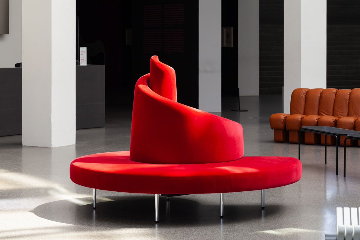 Markanter sind da schon die Sofas Cloverleaf von Verner Panton von 1969, Tatlin von Mario Cananzi und Roberto Semprini von 1989 und das Gufram Patrone Forever von Ceretti, Derossi & Rossi aus dem Jahr 1972, die ihrer Zeit entsprechend mit Farben und Formen herausstechen. Patrone Forever ist einem Stück Rasen nachempfunden; Cloverleaf bedeutet Kleeblatt und lässt diese und viele andere Gruppierungen zu; Tatlin erinnert an einen nie gebauten Turmentwurf als Denkmal für die russische Revolution des konstruktivitischen Künstlers Wladimir Tatlin von 1919.