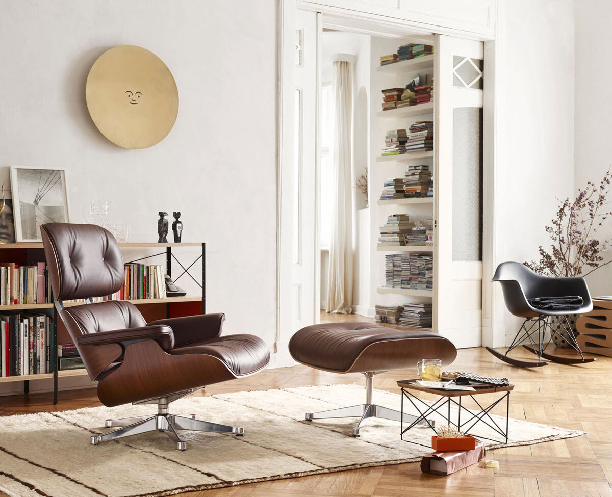 Dass das dunkle Holz sich gut für fligrane Entwürfe eignet, zeigen Sekretär und Barschrank aus der Serie Harri (more), aber auch weichen Kurven wie die des Sengu Table, des 523 Tabouret Méribel Hockers (beides Cassina) oder des Betts Mellow von Zeitraum stehen dem edlen Material gut zu Gesicht. Ganz massiv statt hauchdünn wurde dagegen das Nussbaumholz für den Backenzahn von e15 verarbeitet – für eine besonders exklusive Variante des modernen Designklassikers. Aber auch die Klassiker Lounge Chair, LCW Sessel oder Noguchi Coffee Table (Vitra) profitieren von der besonderen Wirkung des Holzes.