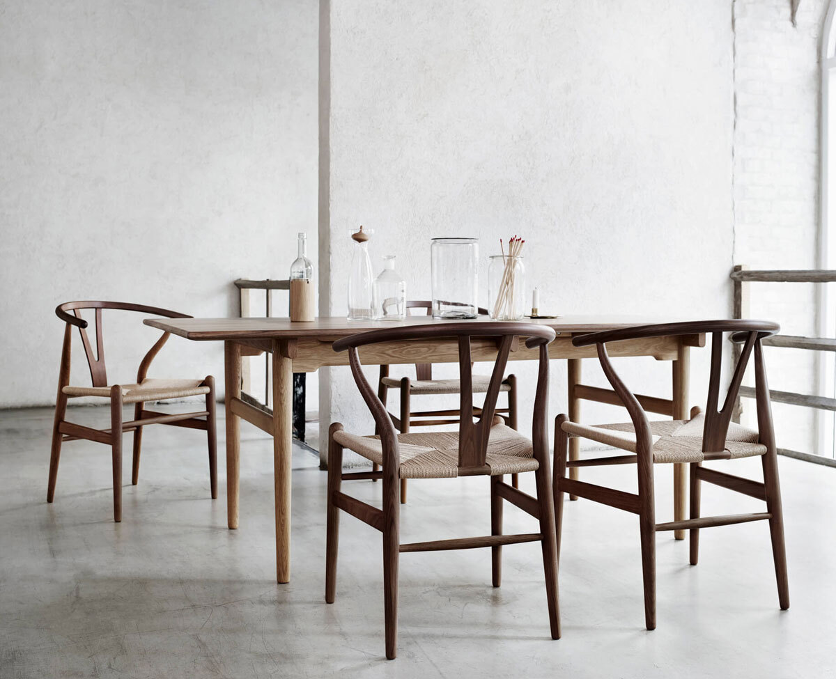 Der Lounge Chair in der minimum-Version: Nussbaum schwarz pigmentiert mit dunkelbraunem Premium-Leder, der Wishbone Chair in Nussbaum — geölt oder lackiert erhältlich und die bulthaup 2