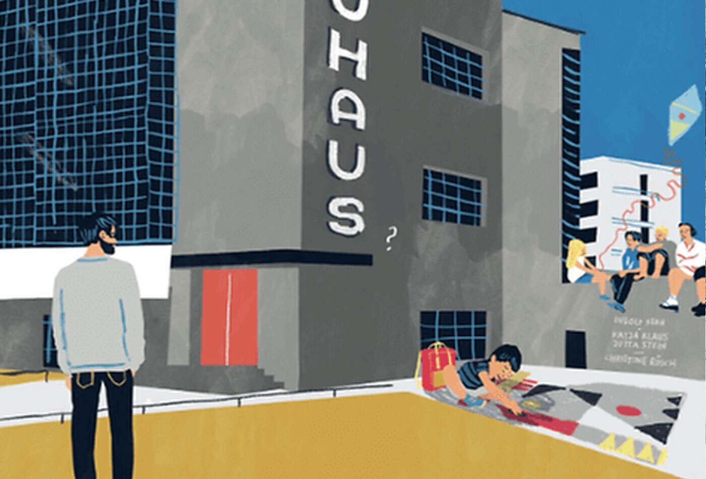 Nach der Besichtigung langweilen sich Lotte und Max, zumal es kein Internet auf ihrem Zimmer gibt. Bei einem lustlosen Versuch, Fußball zu spielen, begegnen sie dem älteren Titus. Der nimmt sie mit auf eine Zeitreise in die Bauhaus-Zeit. Sie trinken Kakao bei Ise Gropius und begegnen Kandinsky, Schlemmer, Moholy-Nagy und Feininger, die ihnen nahebringen, wie man damals am Bauhaus lebte, arbeitete und feierte. Sie entdecken das Bauhaus als große Spielwiese für Kinder und Erwachsene. Besonders schön sind die expressiven Illustrationen von Kitty Kahane, die die LeserInnen auf die Zeitreise mitzunehmen verstehen.